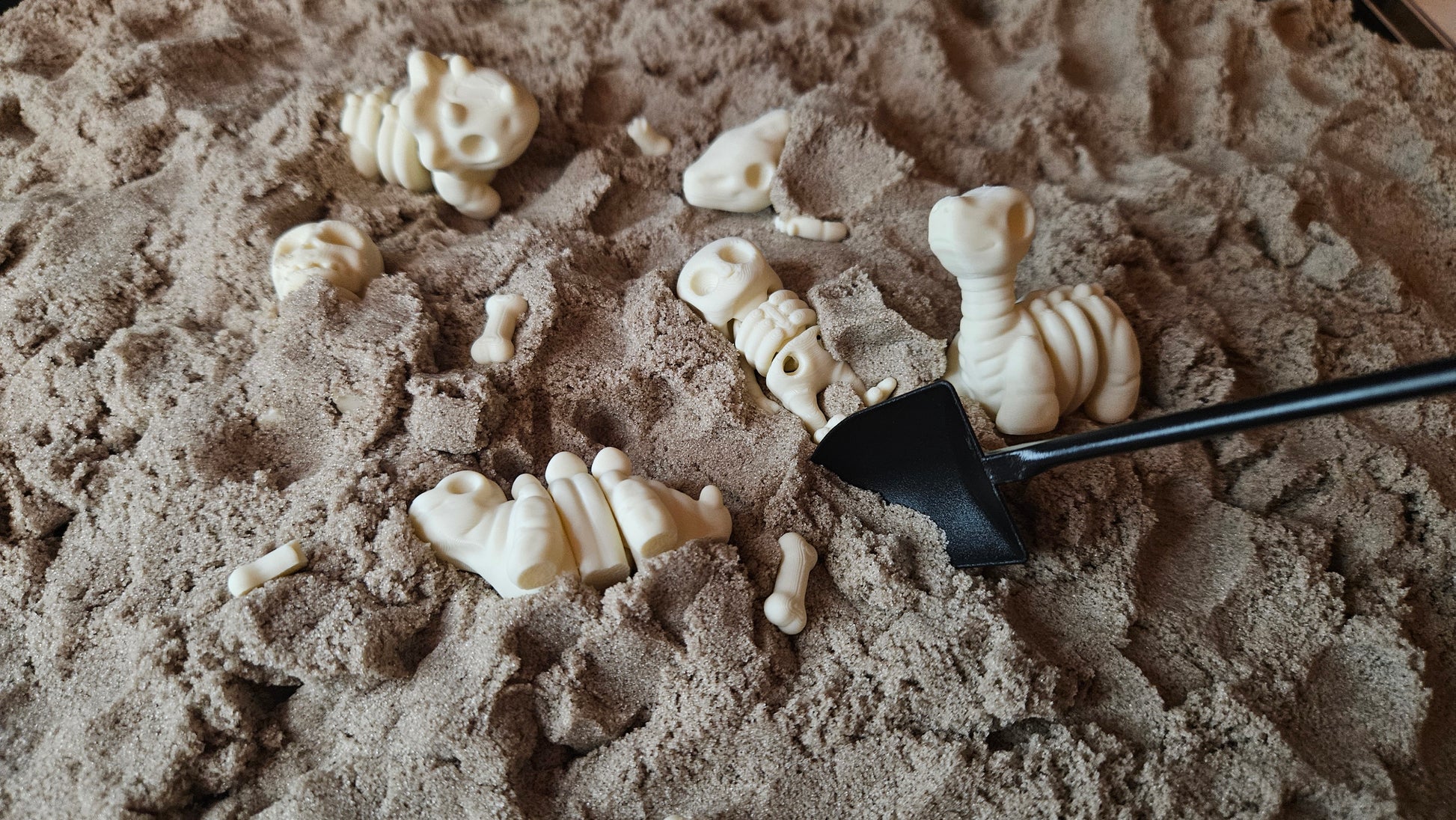 Excavate some skellys and get some fidgets after! Articulated 3D printed skeletons buried in the sand for you to dig up. Skeletons can be used as a fun fidget after or buried again for endless digging. Choose between standard bone white or a spooky glow in the dark color. All printed items are made from safe and non-toxic PLA plastic. Approx 2in in size.