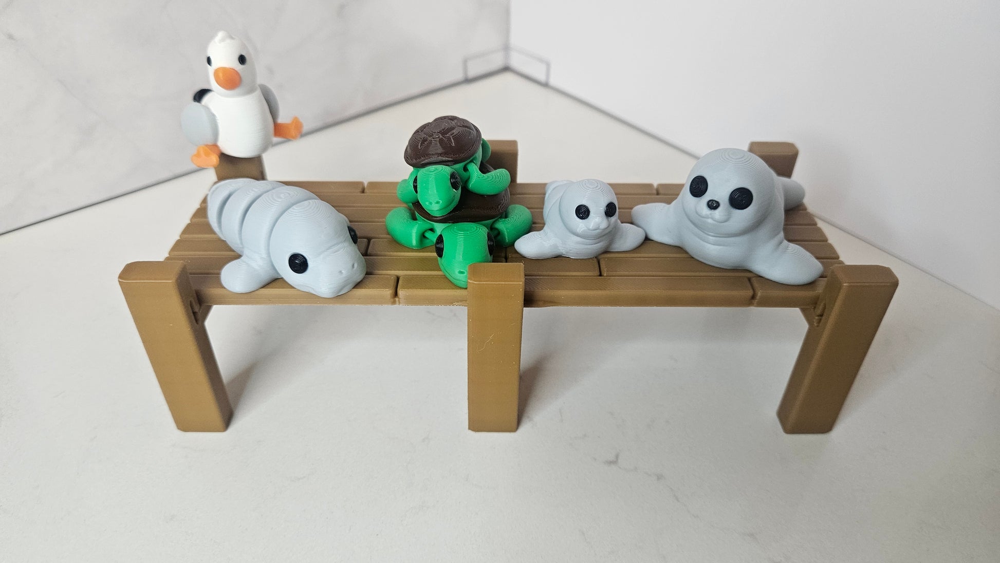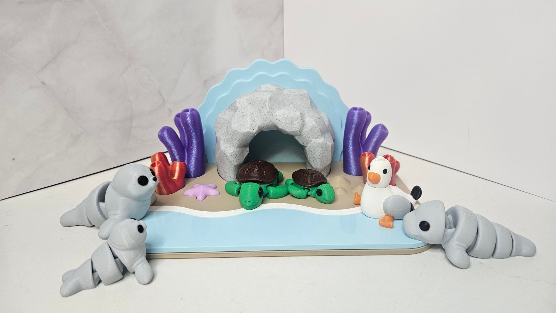 Enjoy a sparkly beach or a dock view with some sea animals. View video to see the sparkly water and color changing coral! All printed items are made from safe and non-toxic PLA plastic.
